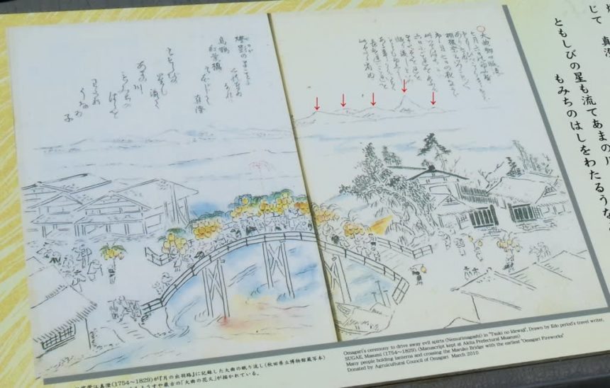 大曲で花火が打ち上げられたのは何時のころからであろうか。藩政期から明治初期を通じての大曲の花火の資料は少ない。文献上で大曲の花火らしきものが初見されるのは菅江真澄著の「月の出羽路」の大曲邑の項で描かれている民俗行事「大曲の郷の眠流」の挿絵である。